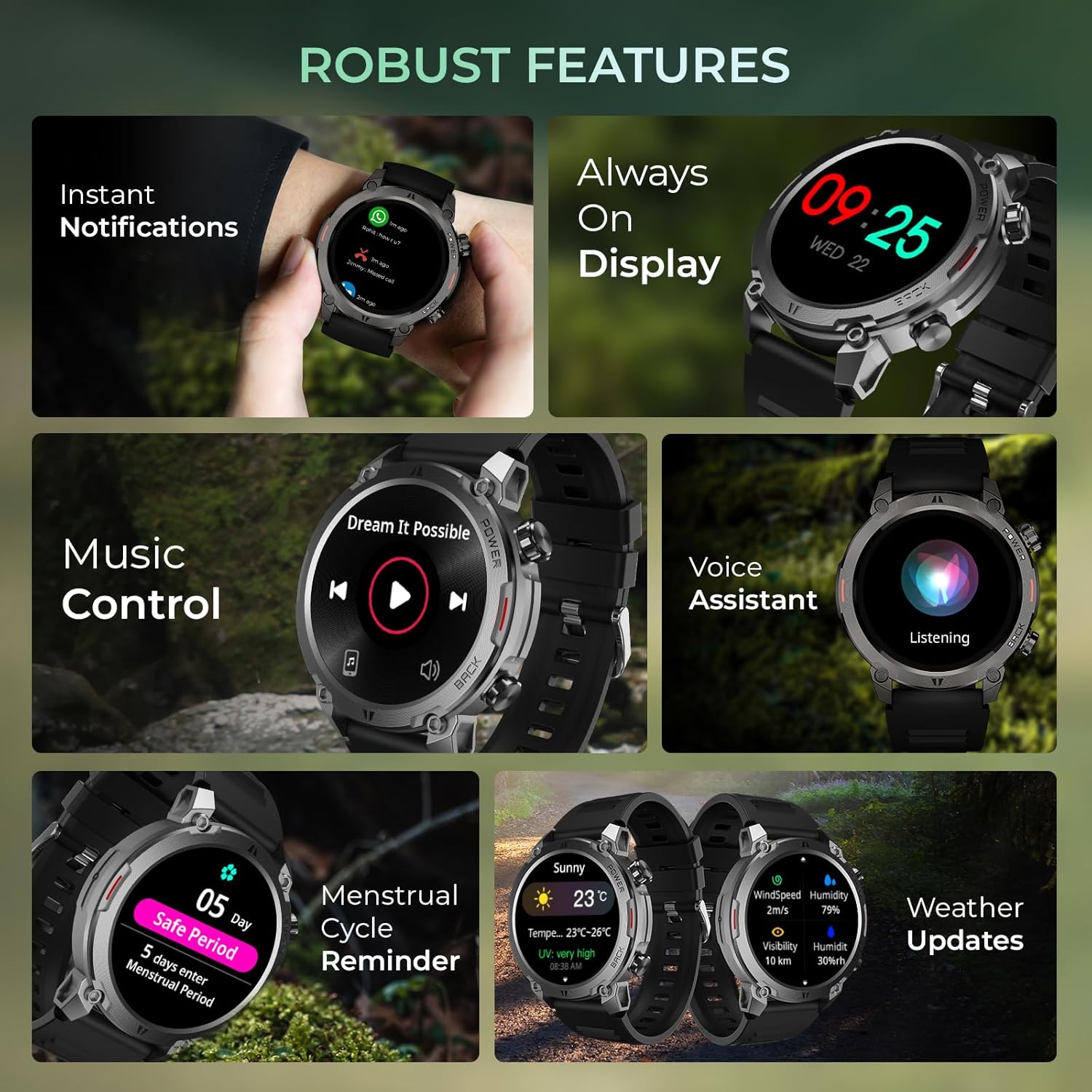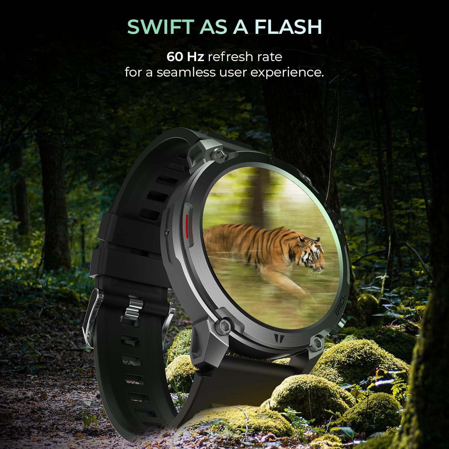 Packed with features designed to elevate your daily life, Terra features an excellent 1.39” display that provides stunning visuals, and brings every detail to life perfectly. The high-resolution display is perfect for reading messages, social media updates, or even making calls.The smartwatch is tough and sturdy, sleek and stylish at the same time. Terra offers an unmatched user experience with 60 Hz refresh rate.
