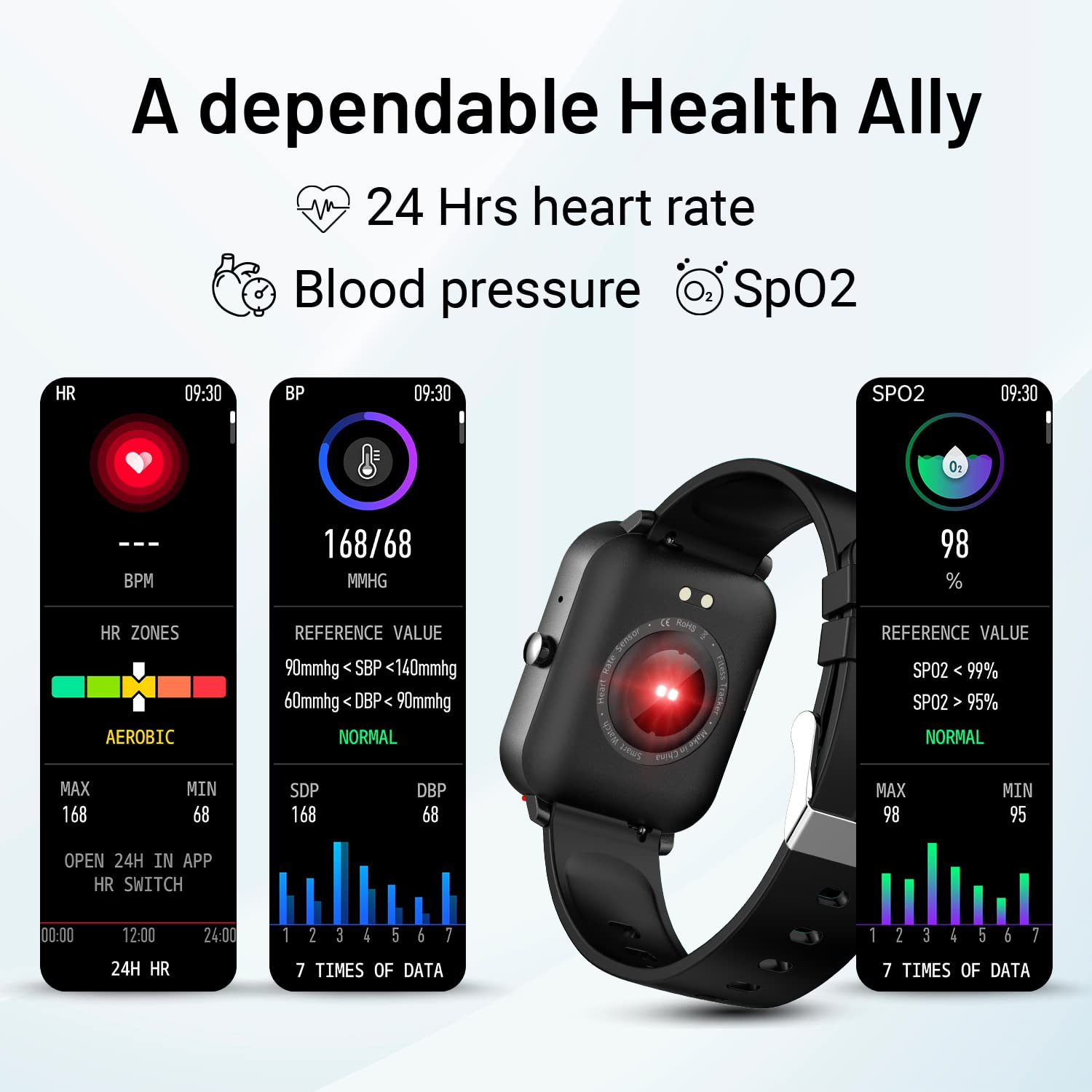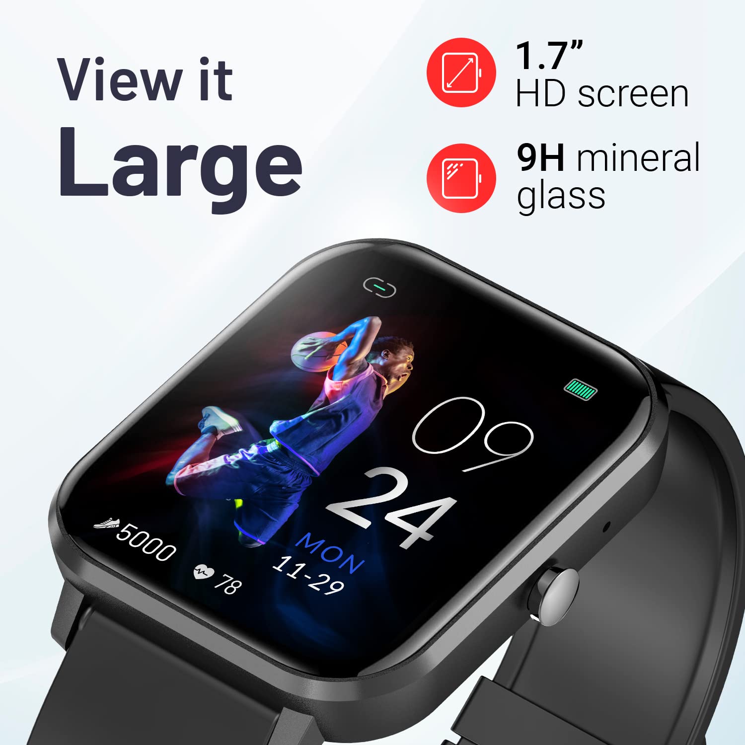 1.7 Inch, HD Display, Bluetooth Calling & Other Notifications, Heart Rate Monitor, BP & Sleep Monitoring, Multiple Sports Mode, Theater Mode, Gesture Control, 250+ Watch Faces, 24 Hrs Tracking, 7 Days Sleep data, 15 Days Battery