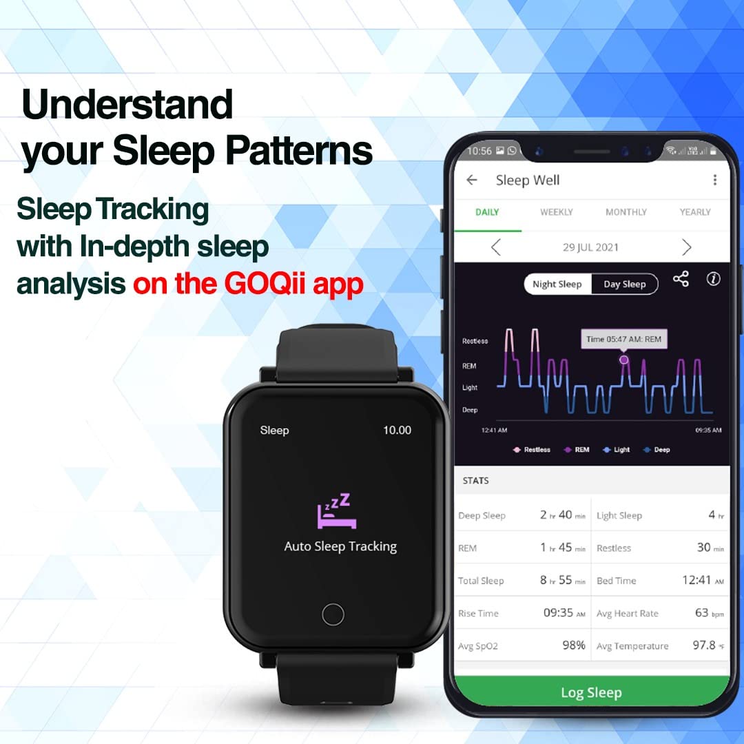 GOQii Smart Vital Plus cutting edge 24*7 heart rate monitor utilizes AI-driven algorithms for high-precision readings. It has heart rate sensors for continuous, non disruptive heart rate monitoring throughout the day and night.