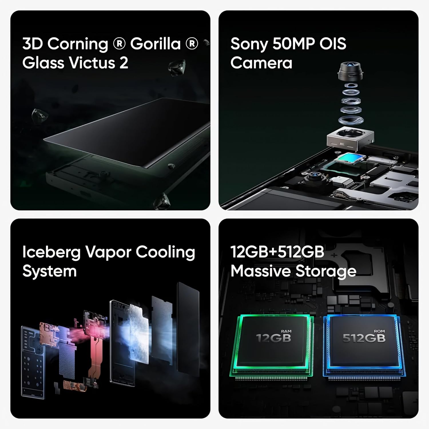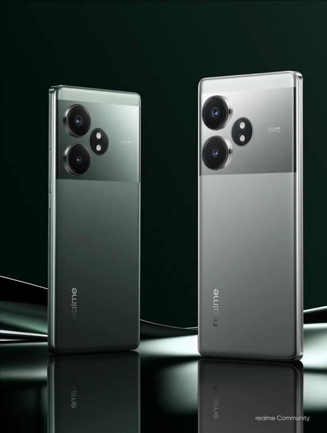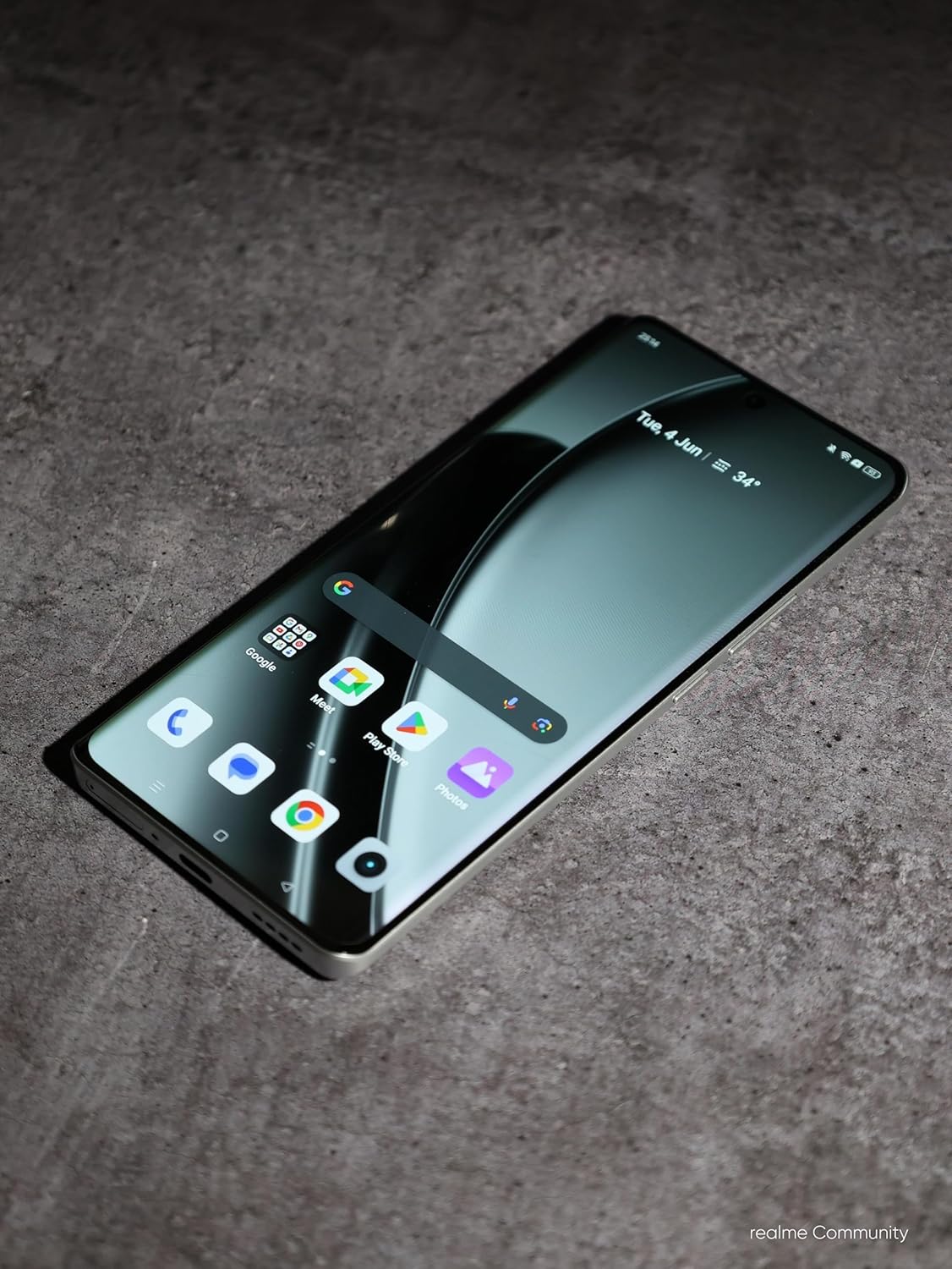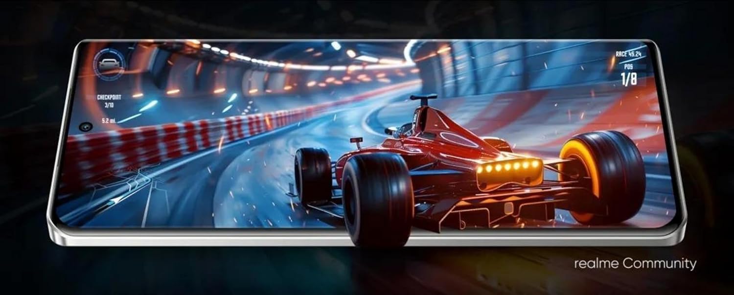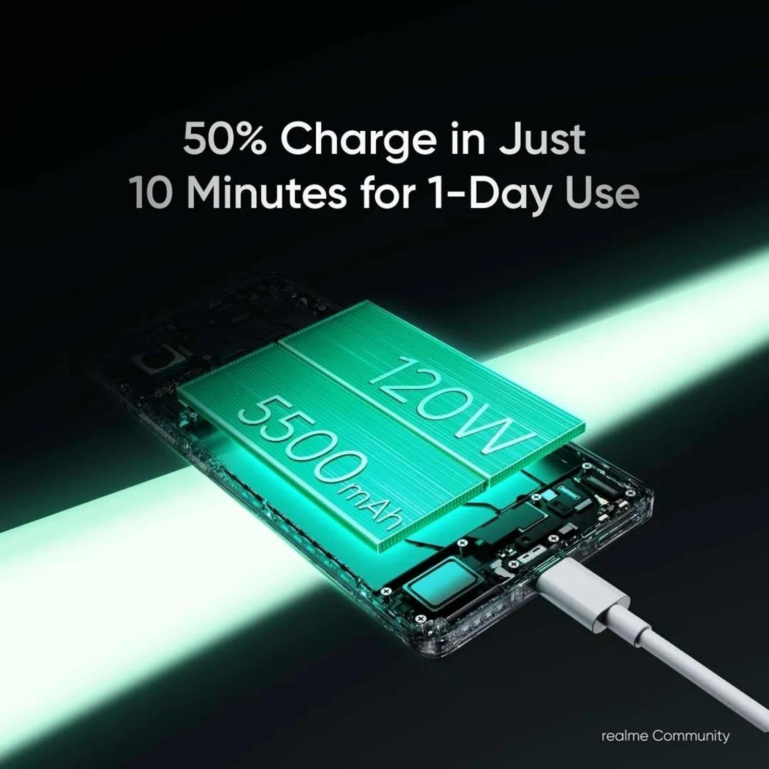 6.78-inch (2780×1264 pixels) 120Hz 8T LTPO AMOLED display with up to 6000 nits peak brightness, Dolby Vision, 100% DCI-P3 color gamut, 3+1 Pluse low-frequency flicker DC dimming, 2160Hz high-frequency PWM dimming, Corning Gorilla Glass Victus 2 protectionOcta Core Snapdragon 7+ Gen 3 4nm Mobile Platform with Adreno 732 GPU at 950MHz8GB / 12GB GB LPDDR5X RAM with 128GB (UFS 3.1) / 256GB (UFS 4.0) / 512GB (UFS 4.0) storageAndroid 14 with realme UI 5Dual SIM (nano + nano)50MP rear camera with 1/1.95″ Sony LYT-600 sensor, OIS, f/1.88 aperture, 8MP IMX355 112° ultra-wide camera with f/2.2 aperture, up to 4K 60 fps video recording32MP front-facing camera with Sony IMX615 sensor, f/2.45 aperture, up to 4K 30 fps video recordingIn-display fingerprint sensorDimensions: 162×75.1×8.65mm;Weight: 191gDust and water resistant (IP65)USB Type-C audio, Stereo speakers, Hi-Res audio5G SA/ NSA (n1/n3/n8/n28A/n40/n41(2535-2655MHz)/n77/n78 bands) Dual 4G VoLTE, Wi-Fi 5 802.11 ax (2.4GHz + 5GHz), Bluetooth 5.4, GPS: L1+L5, GALILEO:E1+E5a, Beidou: B1I+B1C+B2a, QZSS:L1+L5, NFC, USB Type-C5500mAh (typical) battery with 100W SuperVOOC fast charging.