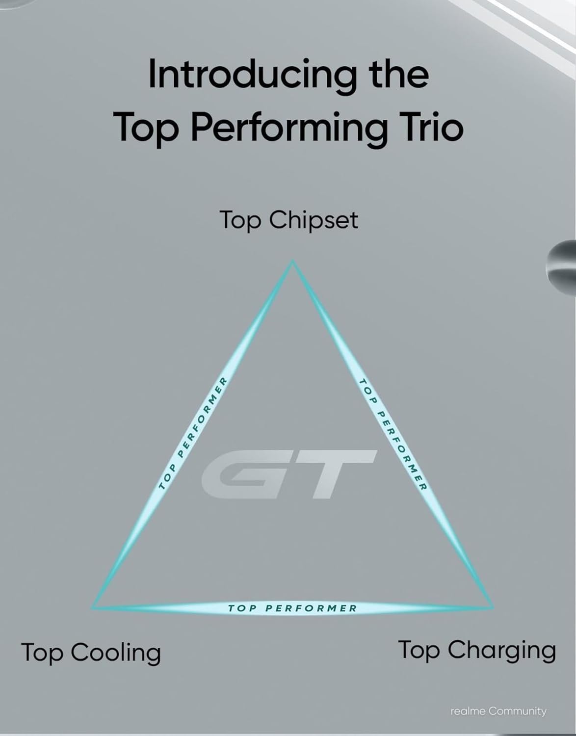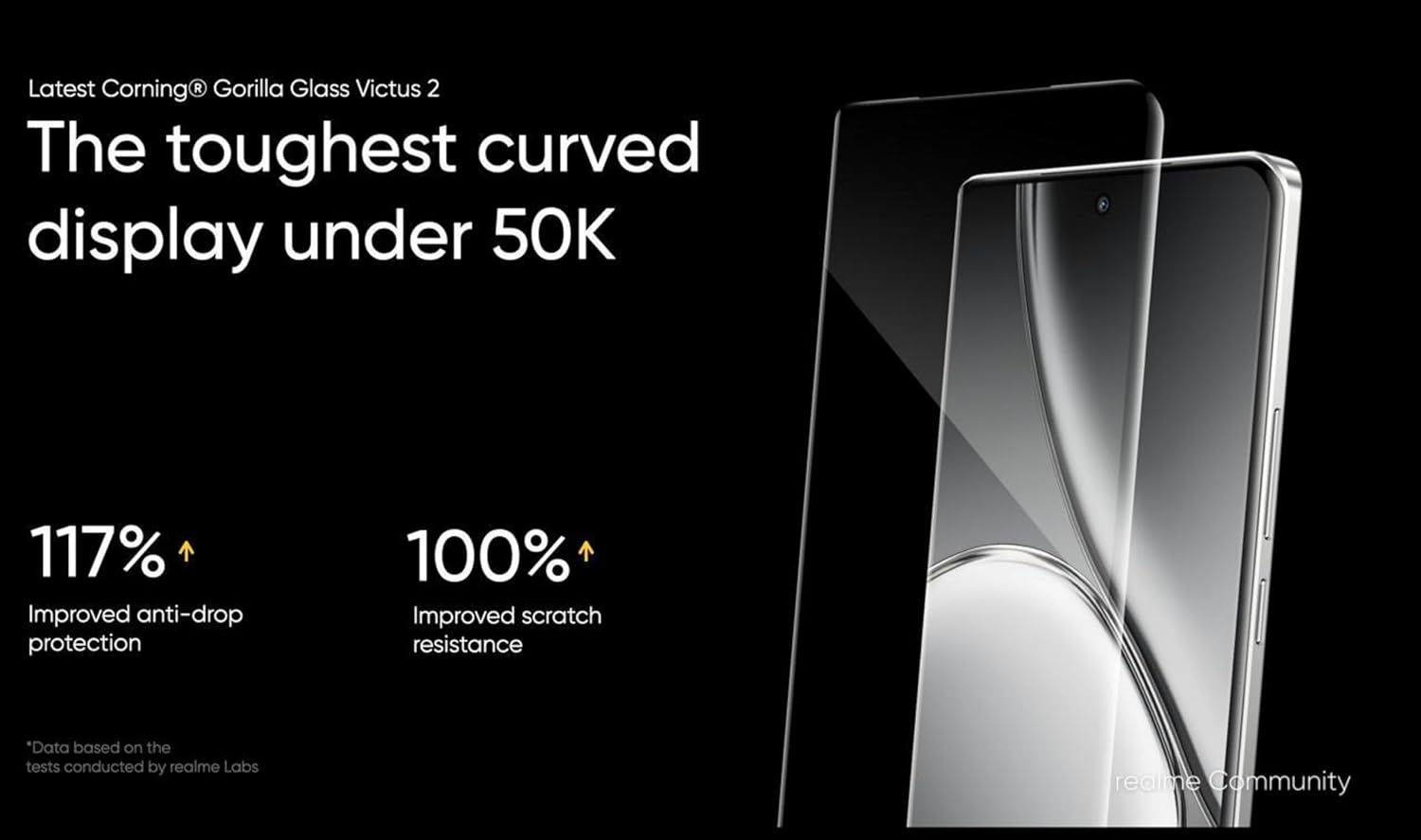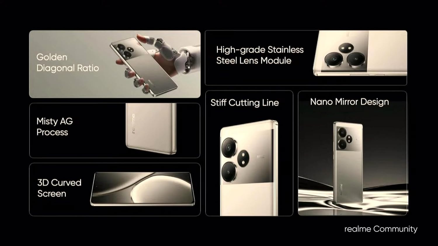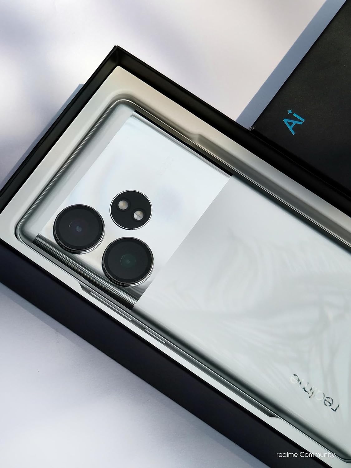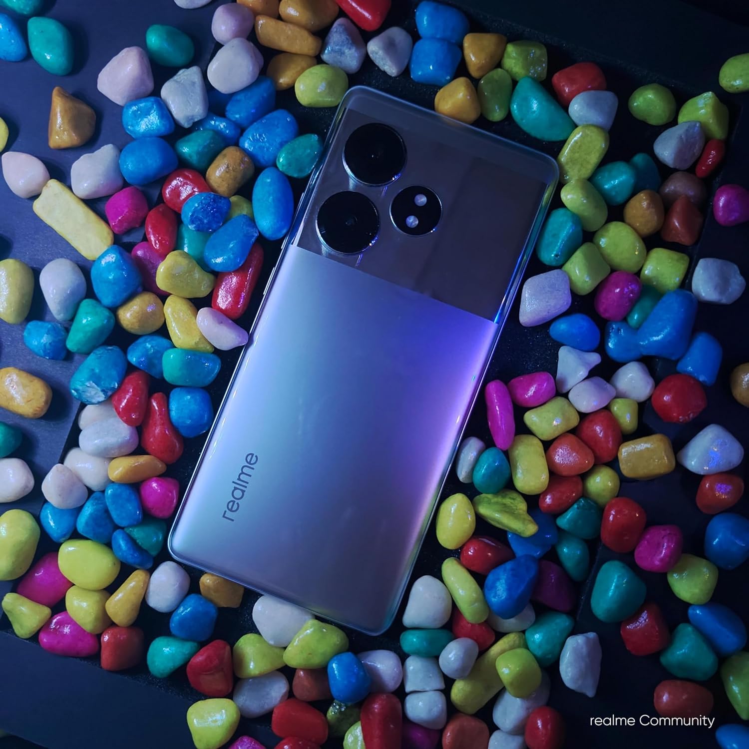 6.78-inch (2780×1264 pixels) 120Hz 8T LTPO AMOLED display with up to 6000 nits peak brightness, Dolby Vision, 100% DCI-P3 color gamut, 3+1 Pluse low-frequency flicker DC dimming, 2160Hz high-frequency PWM dimming, Corning Gorilla Glass Victus 2 protectionOcta Core Snapdragon 7+ Gen 3 4nm Mobile Platform with Adreno 732 GPU at 950MHz8GB / 12GB GB LPDDR5X RAM with 128GB (UFS 3.1) / 256GB (UFS 4.0) / 512GB (UFS 4.0) storageAndroid 14 with realme UI 5Dual SIM (nano + nano)50MP rear camera with 1/1.95″ Sony LYT-600 sensor, OIS, f/1.88 aperture, 8MP IMX355 112° ultra-wide camera with f/2.2 aperture, up to 4K 60 fps video recording32MP front-facing camera with Sony IMX615 sensor, f/2.45 aperture, up to 4K 30 fps video recordingIn-display fingerprint sensorDimensions: 162×75.1×8.65mm;Weight: 191gDust and water resistant (IP65)USB Type-C audio, Stereo speakers, Hi-Res audio5G SA/ NSA (n1/n3/n8/n28A/n40/n41(2535-2655MHz)/n77/n78 bands) Dual 4G VoLTE, Wi-Fi 5 802.11 ax (2.4GHz + 5GHz), Bluetooth 5.4, GPS: L1+L5, GALILEO:E1+E5a, Beidou: B1I+B1C+B2a, QZSS:L1+L5, NFC, USB Type-C5500mAh (typical) battery with 100W SuperVOOC fast charging.