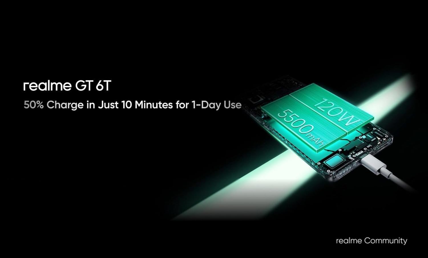The realme GT 6T is equipped with a 5500mAh battery, providing ample power to get through a full day of heavy usage. The device supports 120W SuperVooc Gan charging with Power management chip, which can charge the phone from 0 to 50% in just 10 minutes.Efficient Power Management and Extended Battery Life featuring 120W SUPERVOOC Charge+ and a massive 5500mAh battery, combined with the 8T LTPO Display and Snapdragon 7+ Gen3, this device ensures overall power savings and extended battery life. Enhanced Battery Life with DOU Mode experience up to 1.88 days¹⁷ of battery life. Achieve the same level of fluency while reducing energy consumption by 20%. Under the same scenario, save 300mAh, equivalent to a 5800mAh battery.Instant Recharge, Always Battle-Ready with 120W full-chain GaN charging technology, this device quickly recovers from low battery states. Activate emergency team-up for rapid recovery, ensuring heroes are always ready for deployment.