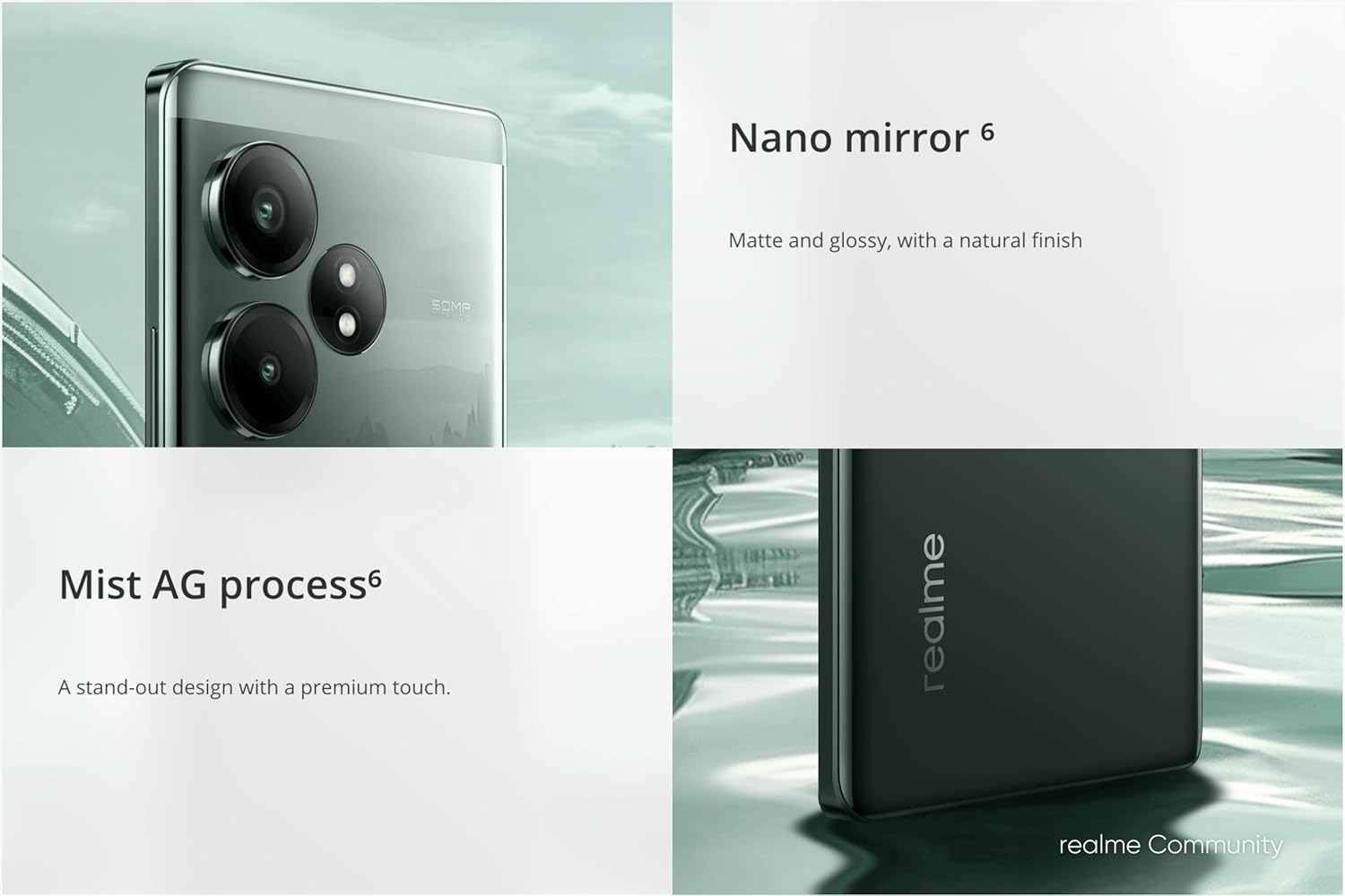 The realme GT 6T boasts a sleek and modern design, with a Nano Mirror Design and a frame that exudes a premium feel Texture. The device is available in several color options, including Fluid Silver, and Razor Green. The back panel features a gradient Mist AG Process finish, which adds a touch of sophistication and elegance. The phone’s dimensions are well-balanced, making it comfortable to hold despite its large display.