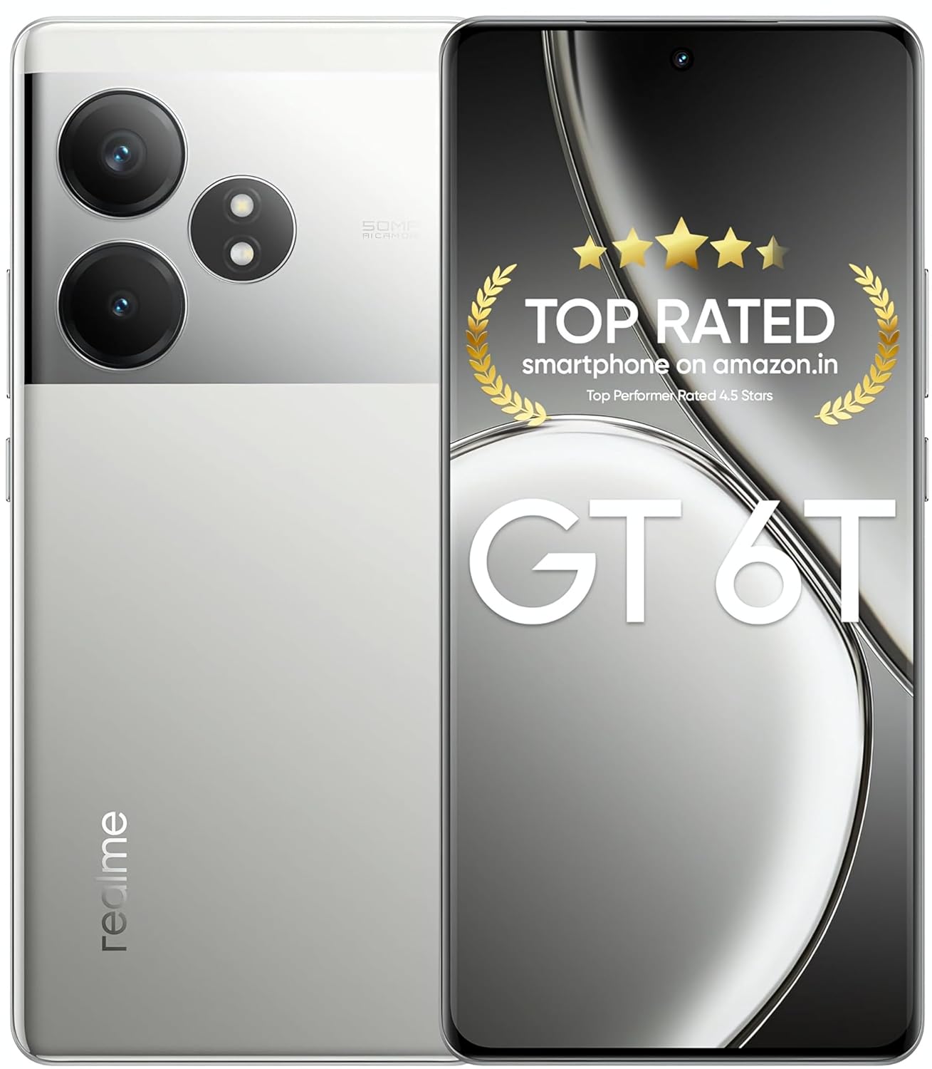 Vibrancy :- Whether you’re on a business trip or enjoying a vacation, the realme GT 6T smartphone, with its generous 6.78-inch 6000 nit Hyper screen and 2780×1264 resolution, lets you indulge in uninterrupted binge-watching. Furthermore, the high 120Hz refresh rate minimises screen tearing during gaming and fast-action scenes, delivering an enhanced experience.Quick App Switching :- Equipped with a 2.8GHz Snapdragon 7+ Gen 3 processor and 12GB RAM, this smartphone offers fast processing and a smooth user experience, even when you’re toggling between multiple apps.Crystal-Clear Photos :- This smartphone is equipped with an enhanced dual-camera system, which includes rear cameras with resolutions of 50MP main, 8MP wide-angle and a 32MP front camera, ensuring high-quality photo quality in a wide range of shooting scenarios. Thus, you can snap everyday moments, like a cup of morning coffee, a vibrant sunset, or your child’s first steps, in high quality.Express Your Creativity :- If you’re a creative storyteller, you will love shooting 4K at 60fps videos using this Realme smartphone.bundant Storage Capacity :- With a capacious storage capacity of 256GB, this 6.78-inch smartphone offers you an abundance of space to accommodate your extensive collection of apps, photos, videos, and files.Enduring Battery :- With its 5500mAh battery, this smartphone offers prolonged usage without the need to constantly monitor and recharge.Fast Charger :- You can quickly power up your smartphone to half of its full battery capacity in a mere 10 minutes using the 120W USB Type-C charger, which is known for its fast-charging capabilities.8T LTPO :- Featuring an LTPO display, this smartphone automatically conserves energy for static content, extending daily usage. Moreover, with enhanced 8T technology, you can enjoy a ghosting and stutter-free experience with smooth frame rate transitions.Enhanced Dimming Solution :- This smartphone has mid-high brightness DC dimming and low brightness high-frequency PWM dimming, each method offers unique benefits. Therefore, this dual-dimming approach reduces flickering, ensuring an enjoyable late-night gaming experience.World’s Brightest Flagship Display: realme GT 6T comes with Corning Gorilla Glass Victus 2 and 1-120Hz Seamless Variable Refresh Rate offering Brightest display with minimum battery consumption. || India’s First Snapdragon 7+ Gen 3 Flagship Chip: Powered by the latest processor technology it promises lightining fast performance. || 50% Charge in 10 Minutes: realme GT 6T features 5500 mAh battery with 120W charging technology. || India’s Largest Cooling System in a Smartphone: realme GT 6T features India’s largest dual VC, 9 layer cooling system offering great performance and Efficiency in every scenario.