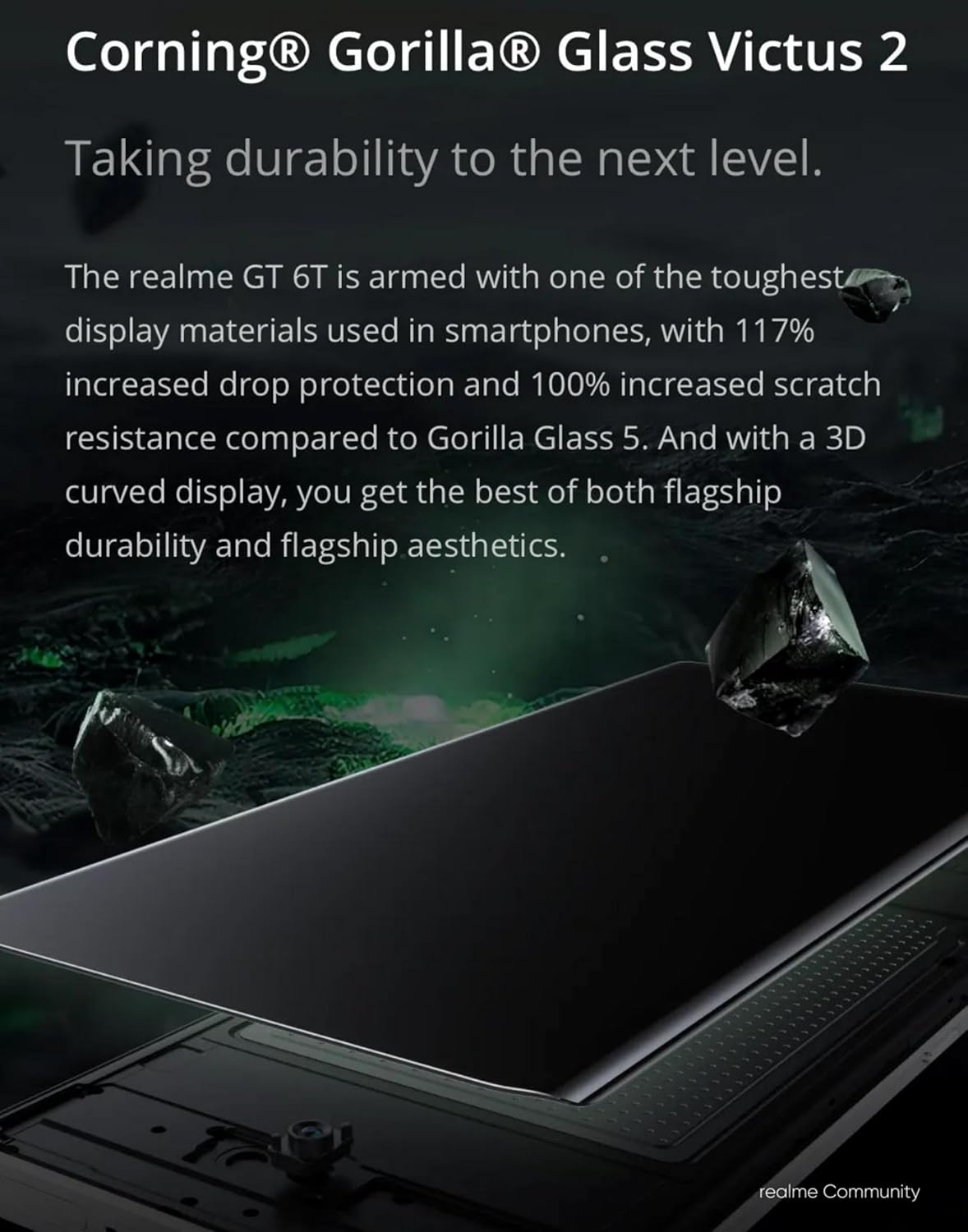 One of the standout features of the realme GT 6T is its 6.7-inch 8T LTPO Pro-XDR Transparent, OLED display with a resolution of 2780*1264 pixels. World’s First 6000nit Ultra Bright Display. The screen supports a 120Hz Refresh Rate & 2500Hz Ultra Responsive Touch, ensuring smooth scrolling and an enhanced gaming experience. The HDR10+ certification ensures vibrant colors 1.07 billion (10bit) and deep contrasts, making media consumption a delight. The display is protected by 3D+ Corning Gorilla Glass Victus 2, offering robust resistance against scratches and accidental drops. LTPO Display Energy Consumption is reduced by 20%.