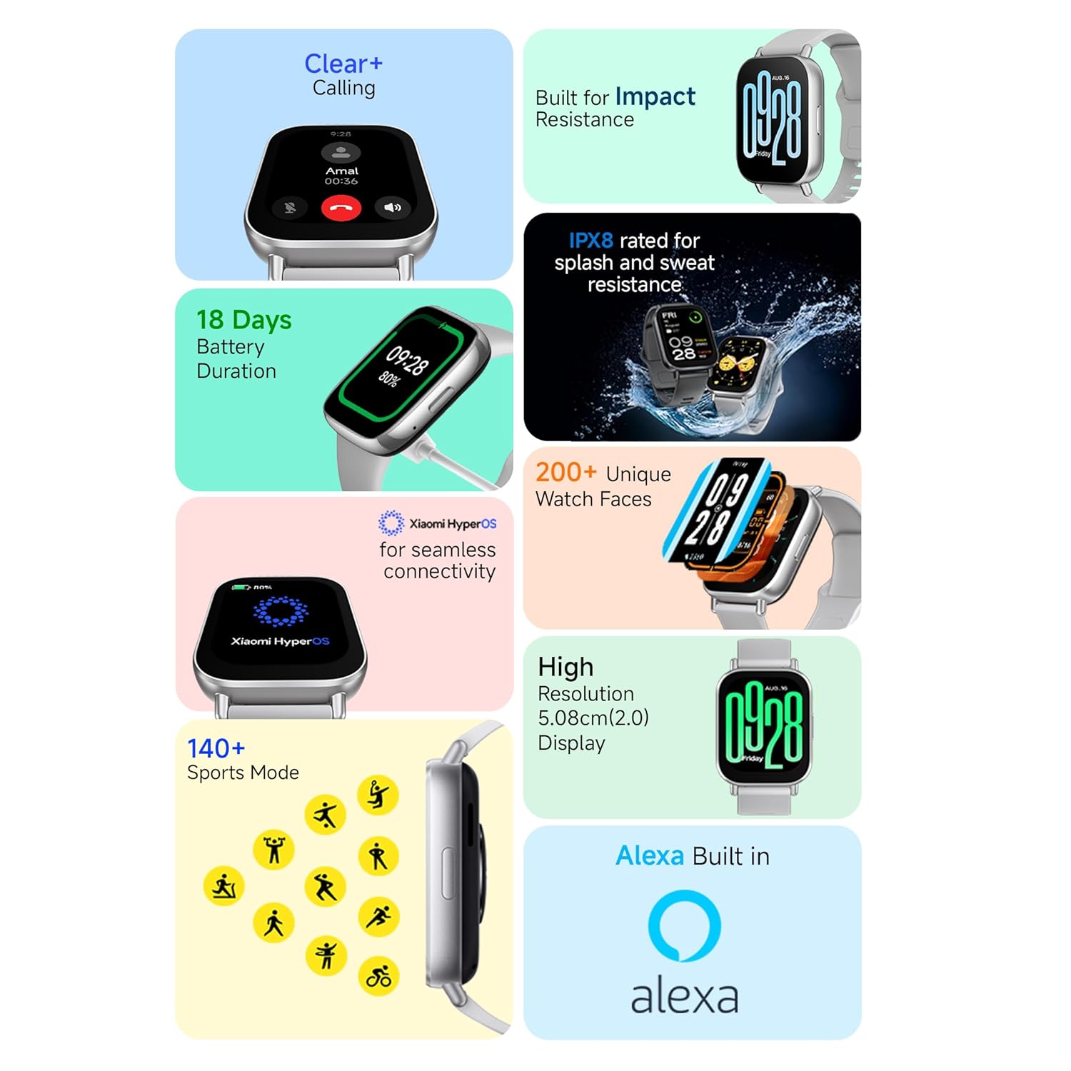 1.) Large 2″ display with 500 nits brightness and 320*385 resolution for the best viewing experience 2.) Clear BT calling experience with 3 mic ENC & easy connectivity with HyperOS 3.) Crafted with Zinc Alloy for a premium metallic finish providing durability for any adventure. 4.) Battery life upto 18 days (12 days with heavy usage mode) backed by a 470 mAh battery 5.) Select from a pool of 200+ watch faces.Set your personal picture as a new watch face. 6.) 5 ATM waterproof, 24*7 health monitoring, 100+ sports mode, period cycle monitoring