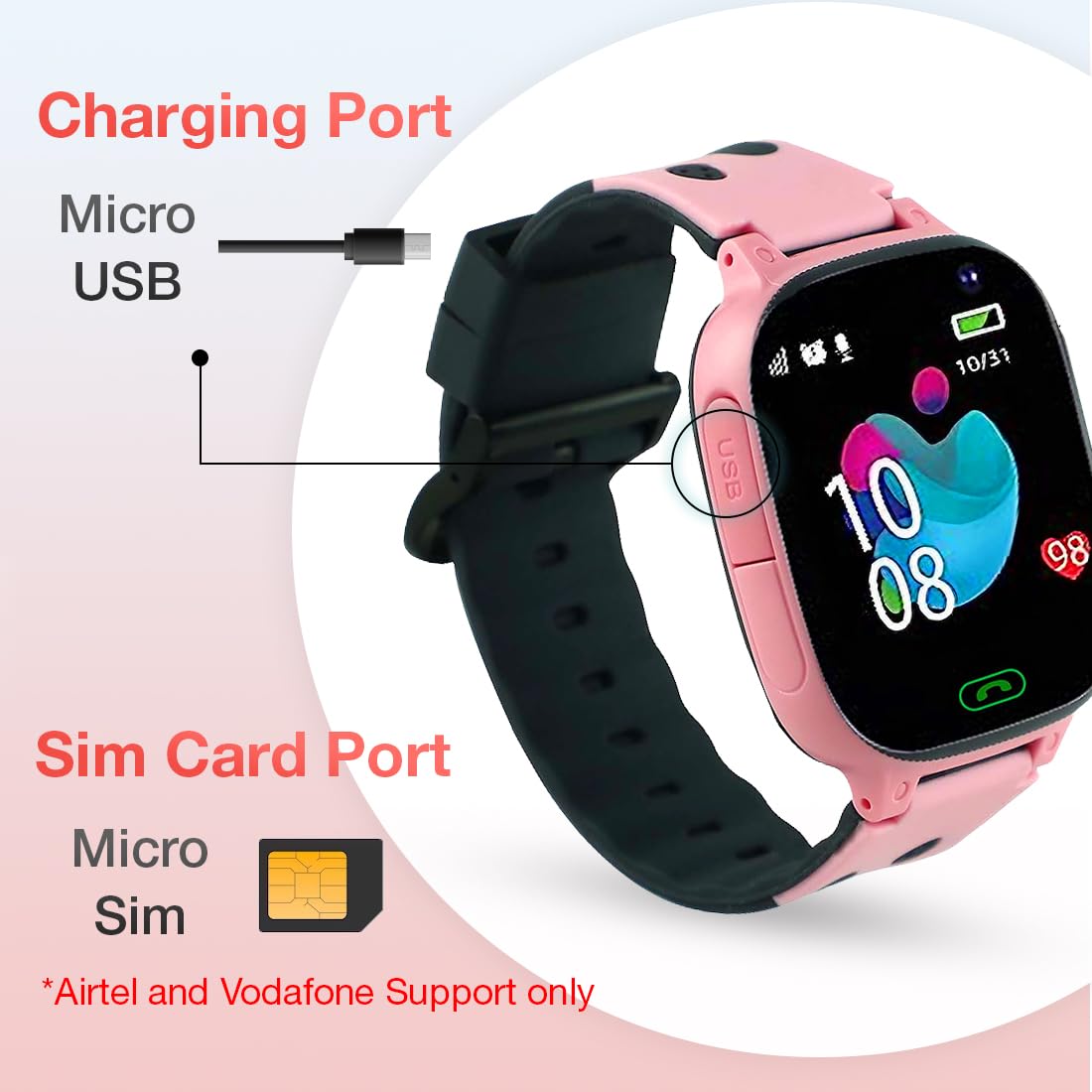 [Network Compatibility] : Airtel & VI sim only. This kids GPS watch is compatible with Micro SIM only. Support all 2G, 3G, 4G, 5G sim cards.